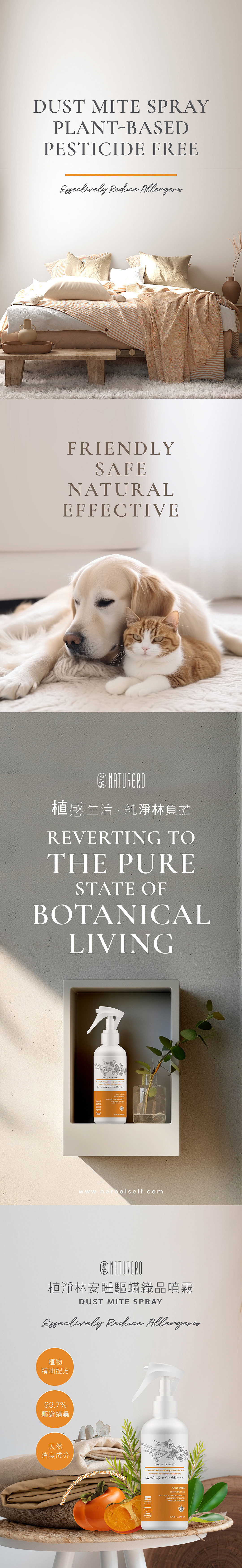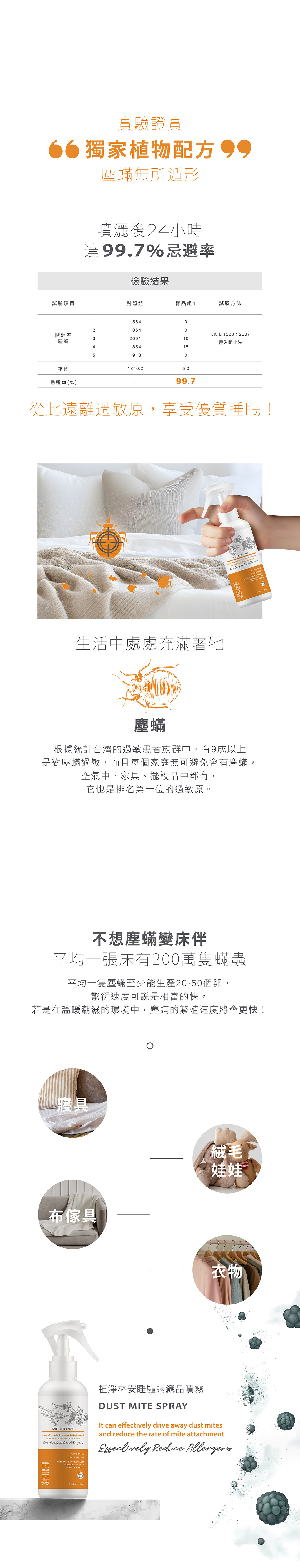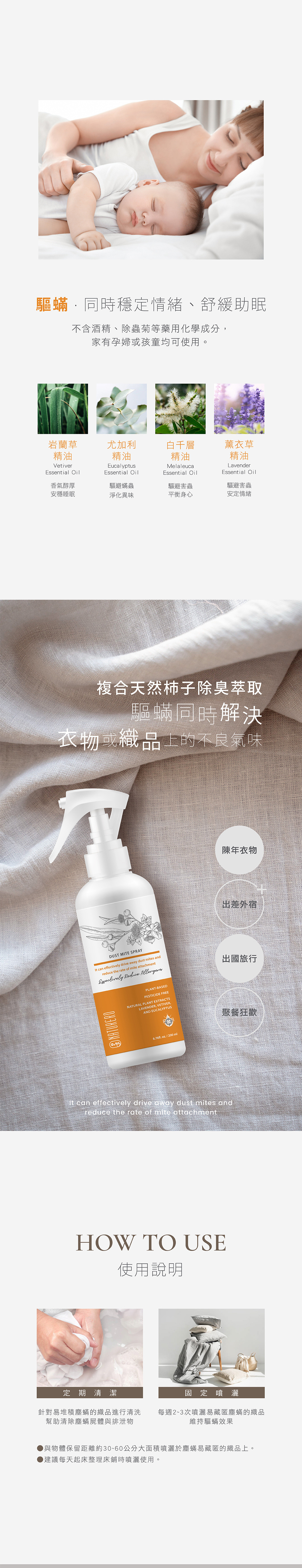 使用方法:距離約30~60公分大面積噴灑於塵蟎易藏匿的織品上,建議每日起床整理床鋪時噴灑使用。