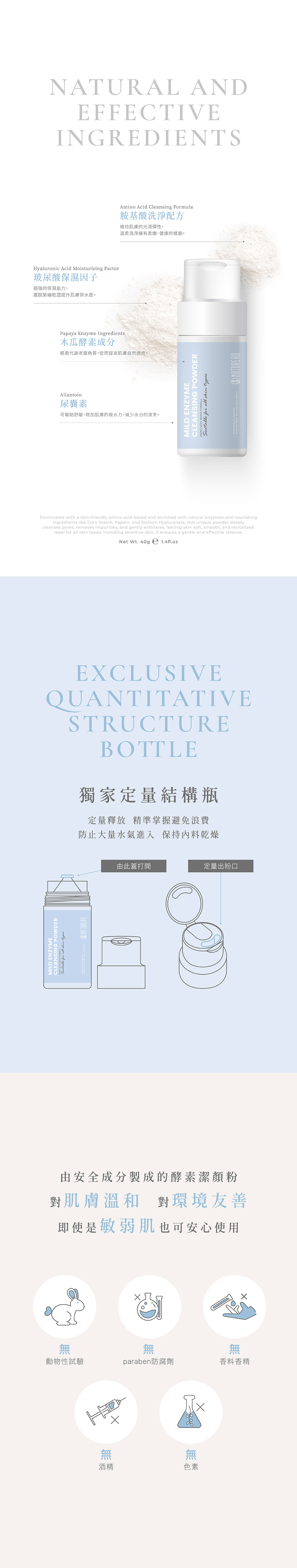 採用對肌膚友好的胺基酸洗淨配方,並添加了天然酵素和舒緩保濕成分,具有溫和去角質作用,同時幫助分解肌膚表面油溶性物質,促進肌膚更新、通暢毛孔。無香精、無色料,敏感肌適用。