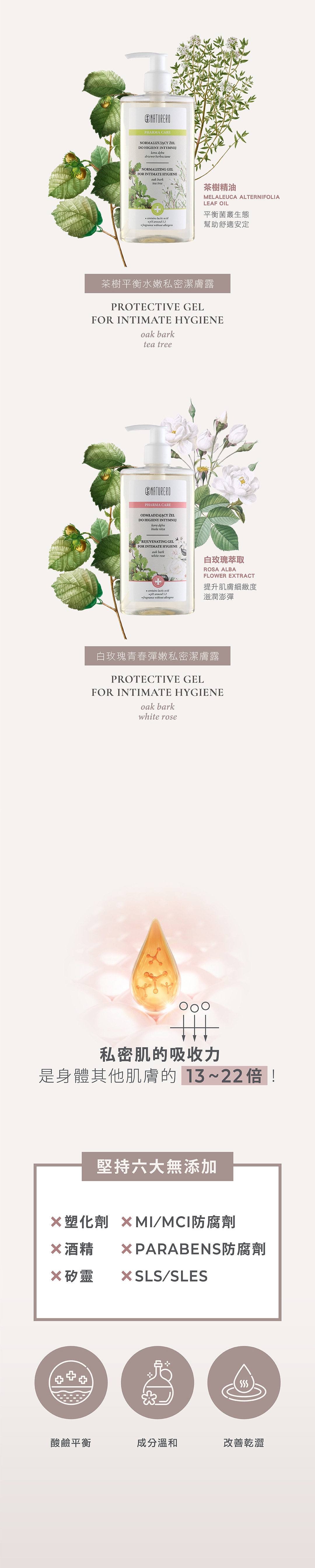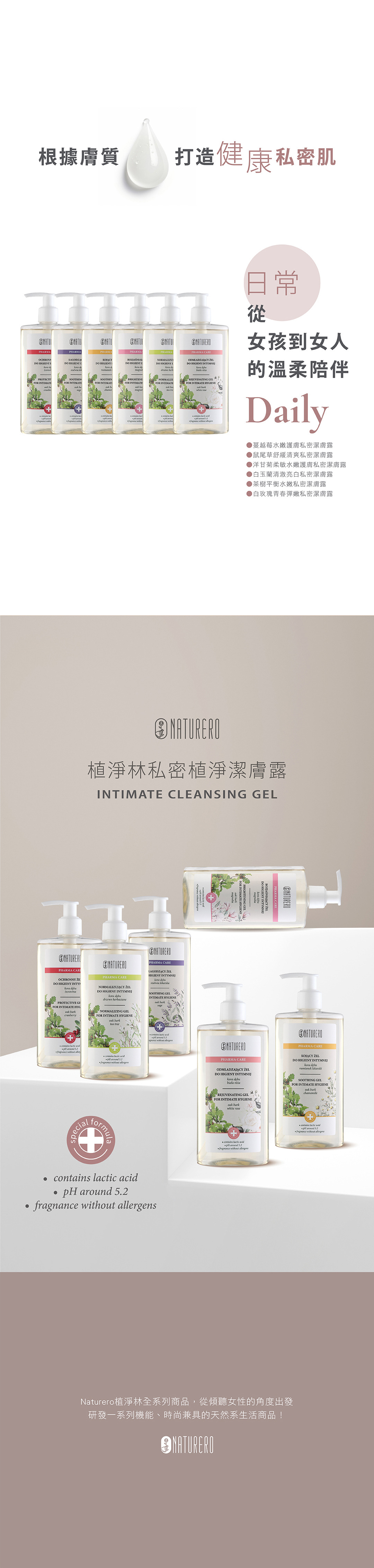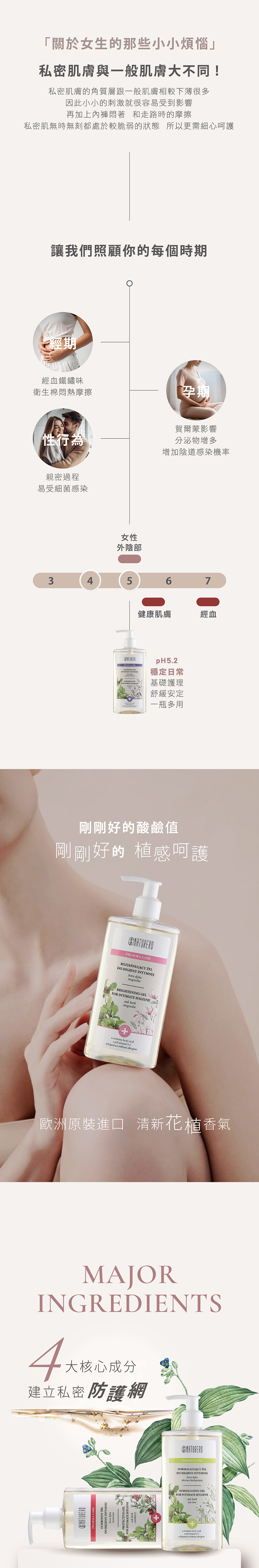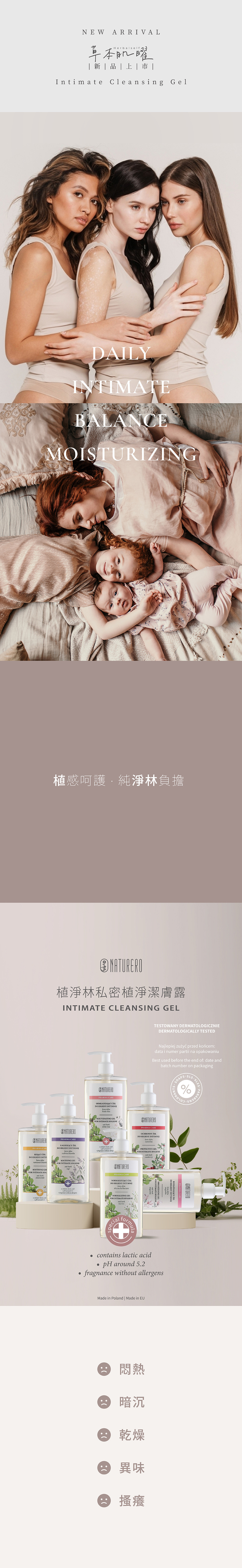 ►無皂鹼、Paraben防腐劑、人工色素、致敏性香精、SLS及SLES介面活性劑,pH值約5.2與私密肌相近,避免清潔時的刺激感,守護私密環境平衡,洗後備感清爽無負擔。