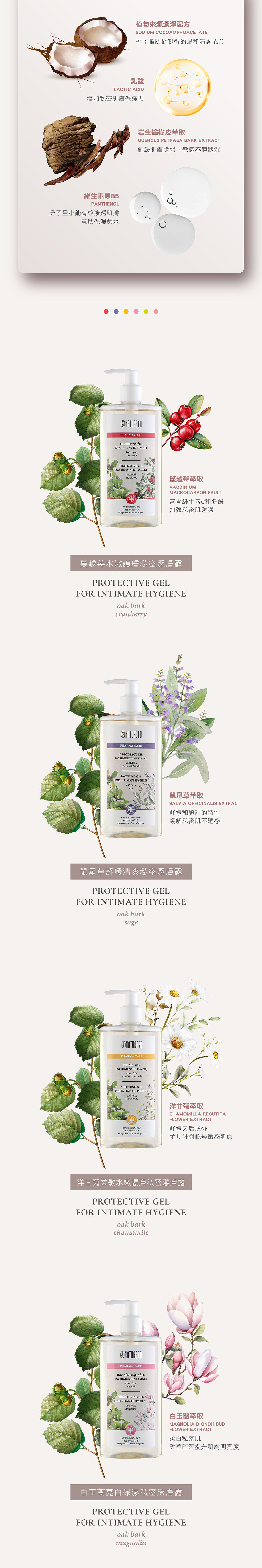 ►茶樹精油結合乳酸及橡樹,溫柔潔淨脆弱的私密肌膚,幫助安撫乾敏或特殊時期的脆弱不適,還原私密肌自然平衡的狀態。再以甘油及維生素原B5加強保濕,緩解乾燥,洗後備感舒適、水潤。