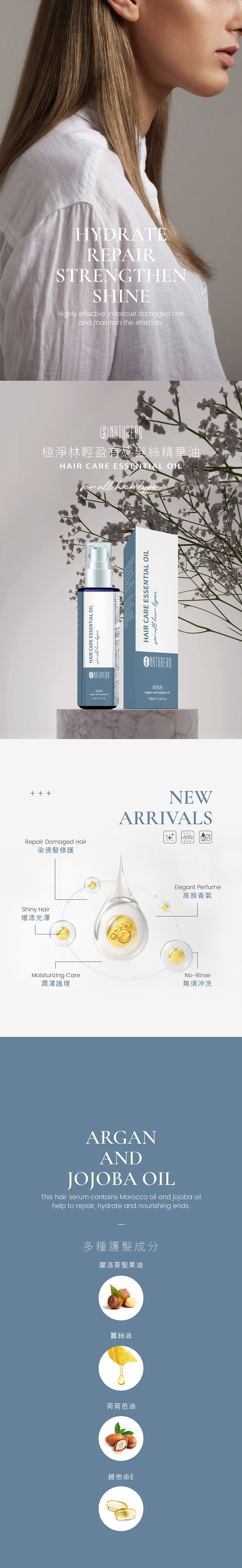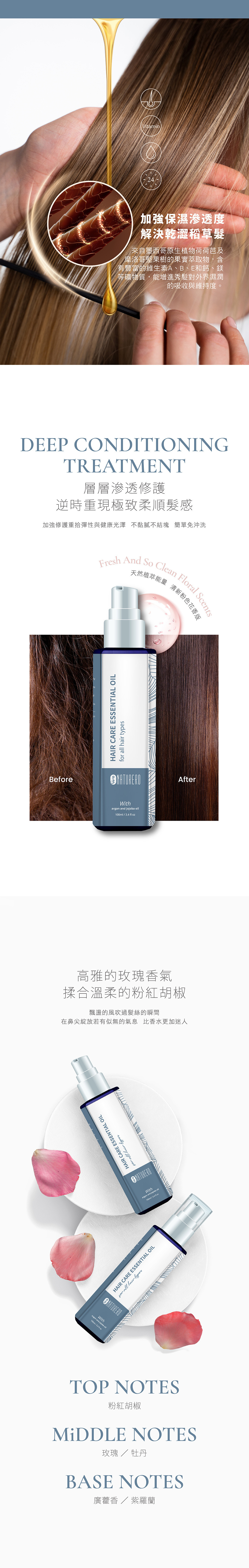 精華油採用蠶絲油、摩洛哥堅果油與荷荷芭油・同時混合粉紅胡椒與玫瑰香氣,使用後髮絲柔順有感且能保持順亮光澤,還能散發魅力髮香。細緻不黏膩的輕盈質地,洗髮後使用更易梳理,吹整後柔順不毛躁。維他命E能加強髮絲修護,同時還可加強隔離熱風、日曬,使秀髮立即呈現健康亮麗的色澤!