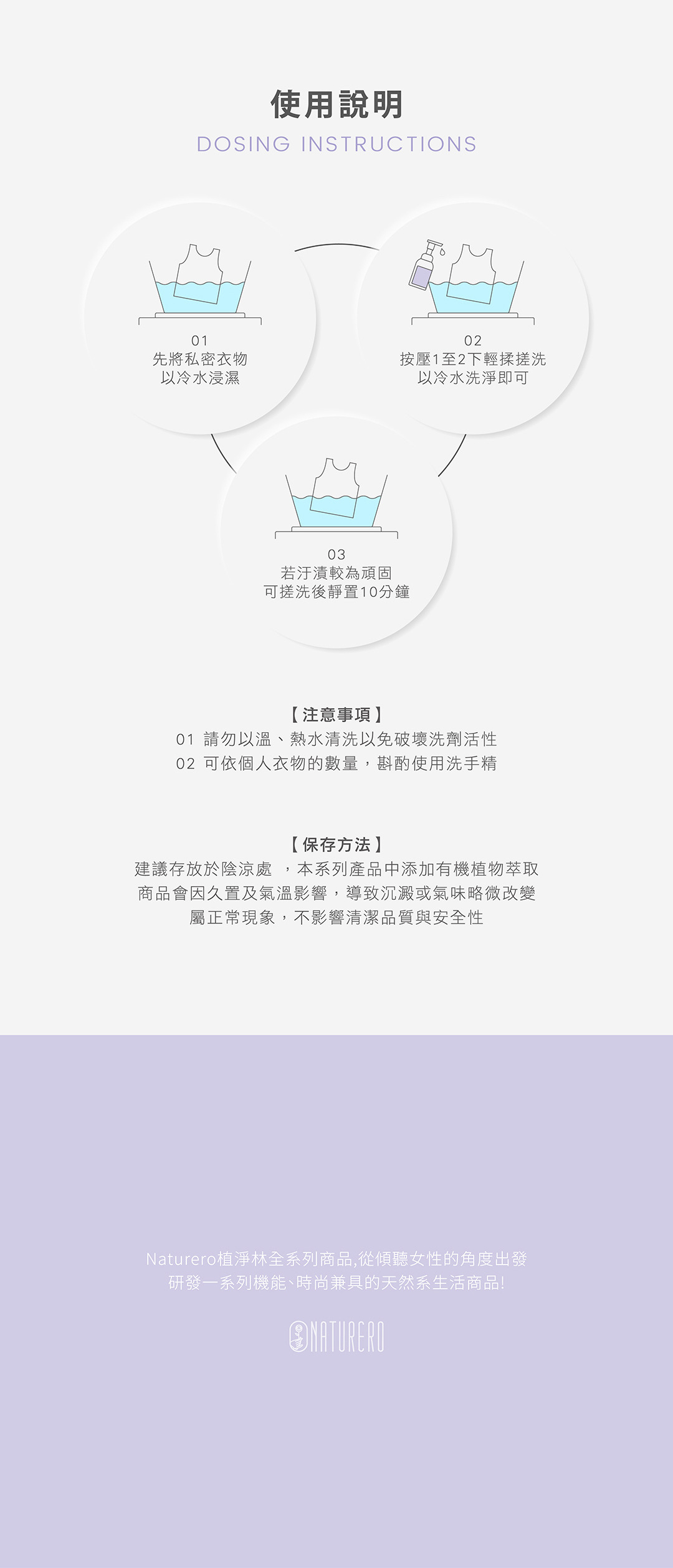 3. 請勿以溫、熱水清洗以免破壞洗劑活性,搓洗後請勿靜置過久,避免導致汙漬反咬。