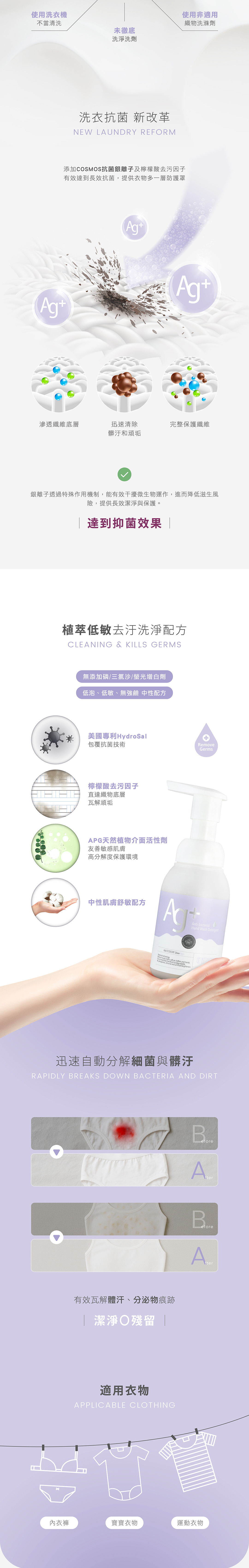 • 專為貼身衣物設計,專利抗菌包覆技術,迅速洗淨血漬、分泌物、汗水等汙垢,洗後小褲褲超安心,生活更舒適。