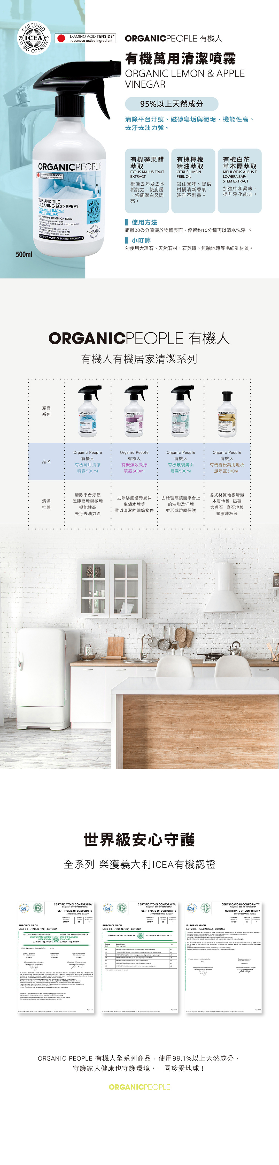 ✿有機檸檬&蘋果醋萃取,結合植萃胺基酸潔淨配方,強效去除水垢雜質及皂垢、瓦解磁磚隙縫中的污垢及異味, 添加清檸精油,香氣淡雅不刺鼻,適用於廚房、浴廁清潔。